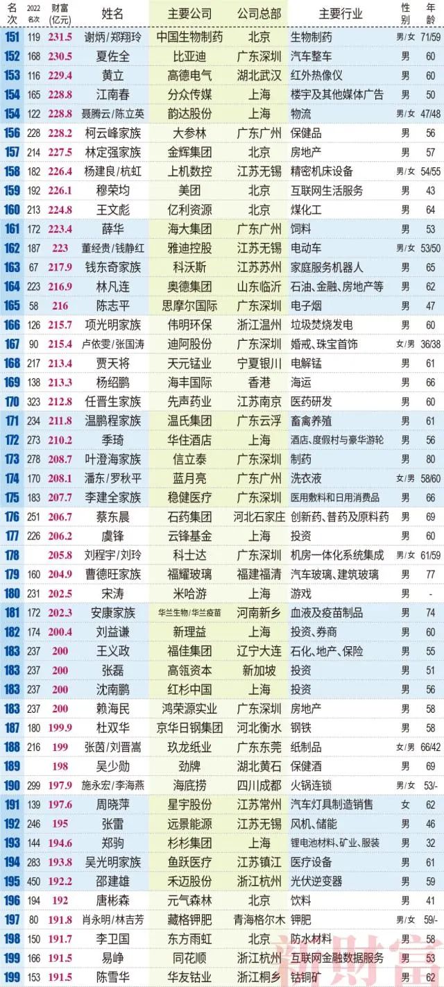 6、海大集团薛华以223.4亿元,位居第161位;