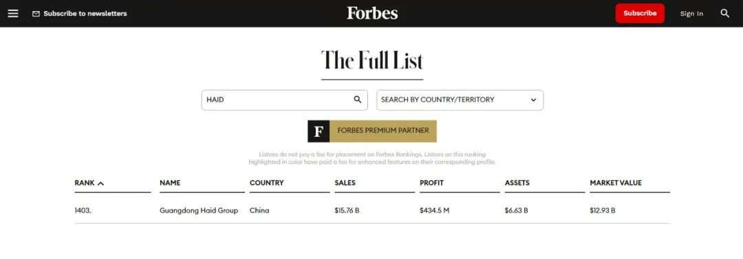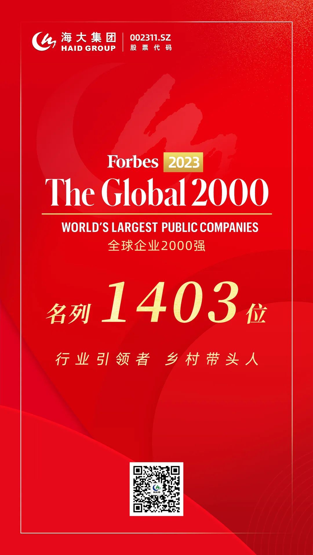 6月8日,美国《福布斯》杂志发布了2023年“全球上市公司2000强”排行榜(Forbes The Global 2000)。海大集团凭借强劲的综合实力跻身福布斯全球企业2000强第 1403 位,较上一年度跃升 23 位,在上榜的中国企业中排名第 194 位。截至今年,海大集团已连续四年登榜。