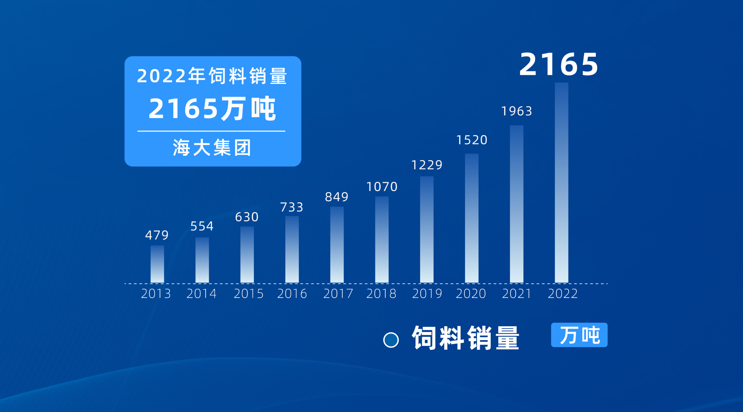海大集团于1998年从饲料起步,逐步覆盖种苗、饲料、动保疫苗、智慧养殖、食品加工等全产业链。在核心主业饲料板块,2022年总销量达到2165万吨。基于强大的产品力、服务力和科研力,海大集团饲料近十年来销量持续稳健增长。