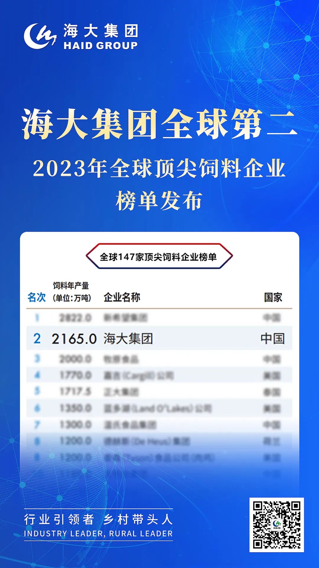 近日,WATT国际传媒发布最新全球147家顶尖饲料企业榜单。海大集团以2022年饲料总销量2165万吨,排名跃升至全球第二,保持着稳健向上的发展趋势。