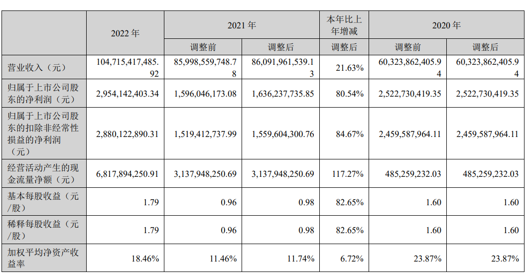 2022年,海大集团的营业收入为1047.15亿元,同比增长21.63%;归属于上市公司股东的净利29.54亿元,同比增长80.54%;归属于上市公司股东的扣非净利润28.80亿元,同比增长84.67%;经营活动产生的现金流量净额为68.18亿元,同比增加117.27%。