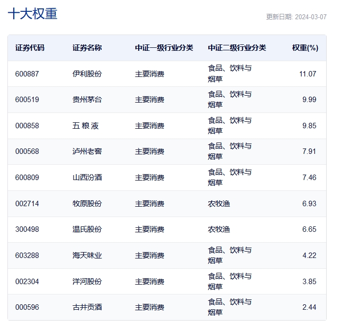 数据显示,截至2024年3月7日,中证主要消费指数(000932)前十大权重股分别为伊利股份(600887)、五粮液(000858)、贵州茅台(600519)、泸州老窖(000568)、山西汾酒(600809)、牧原股份(002714)、温氏股份(300498)、海天味业(603288)、洋河股份(002304)、海大集团(002311),前十大权重股合计占比70.36%。