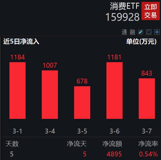 从资金净流入方面来看,消费ETF近5天获得连续资金净流入,最高单日获得1184.40万元净流入,合计“吸金”4894.82万元,日均净流入达978.96万元。