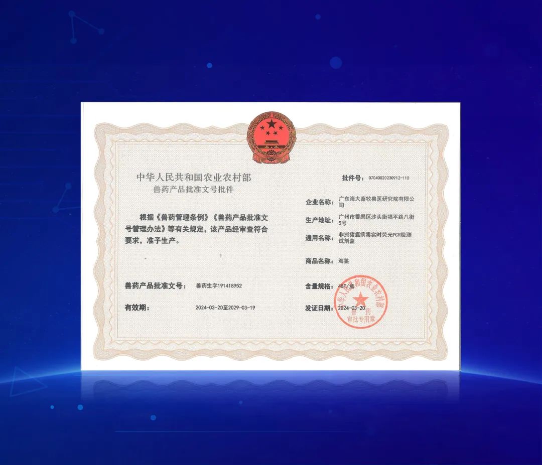 日前,海大集团旗下广东海大畜牧兽医研究院有限公司收到农业农村部签发的《兽药产品批准文号批件》,批准非洲猪瘟病毒实时荧光PCR检测试剂盒通过注册,意味着此款产品可进入生产程序。
