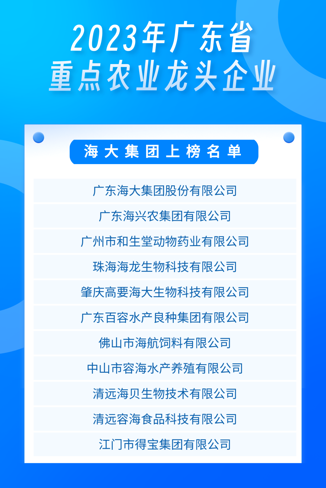 近日,广东省农业农村厅公布《关于公布2023年广东省重点农业龙头企业名单的通知》,海大集团及旗下10家分子公司荣登榜单,产业涉及饲料生产、种苗繁育、动保疫苗、水产养殖、食品加工等领域,充分展现出海大集团丰富完整的产品配置和全产业链布局。