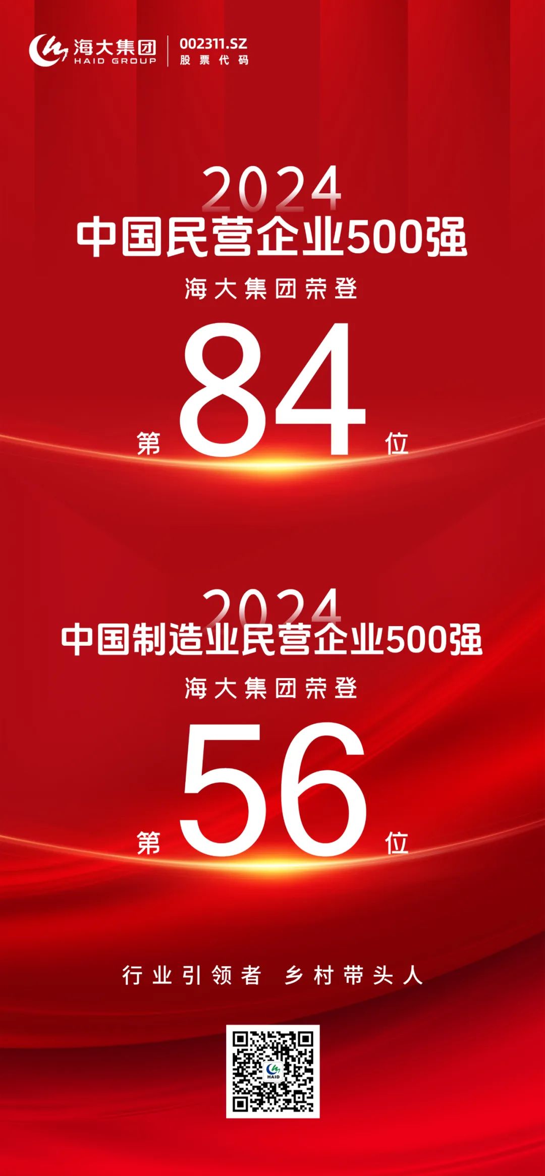 10月12日,全国工商联发布“2024中国民营企业500强”榜单。凭借稳健的发展实力,海大集团以2023年营收1161亿元荣登中国民营企业500强第84位,相比去年跃升3位。在同时发布的“2024中国制造业民营企业500强”榜单中,海大集团名列第56位。