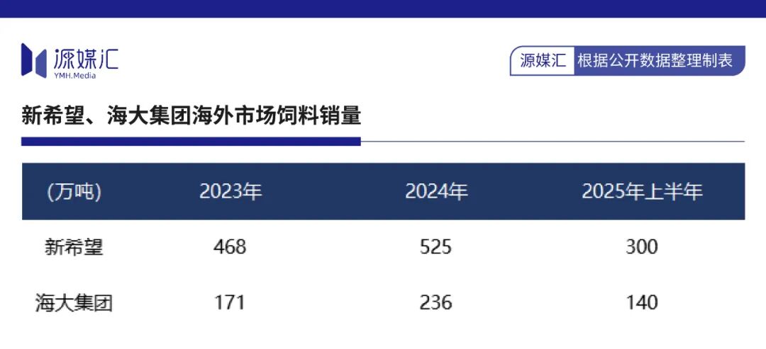 2024年,新希望实现海外饲料销售525万吨,同比增长12.2%。同期,海大集团海外地区饲料销售量为236万吨,同比增长38%;2025年上半年,新希望实现海外饲料销售超300万吨,海大集团则为超140万吨,差距在逐步缩小。
