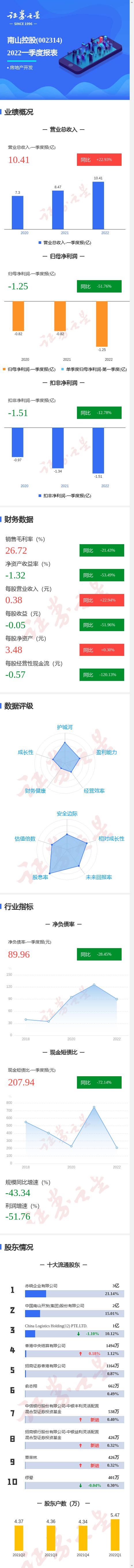 南山控股2022一季报显示,公司主营收入10.42亿元,同比上升22.93%;归母净利润-12586.18万元,同比下降51.76%;扣非净利润-15175.29万元,同比下降12.78%;其中2022年第一季度,公司单季度主营收入10.42亿元,同比上升22.93%;单季度归母净利润-12586.18万元,同比下降51.76%;单季度扣非净利润-15175.29万元,同比下降12.78%;负债率76.2%,投资收益9261.53万元,财务费用1.47亿元,毛利率26.72%。