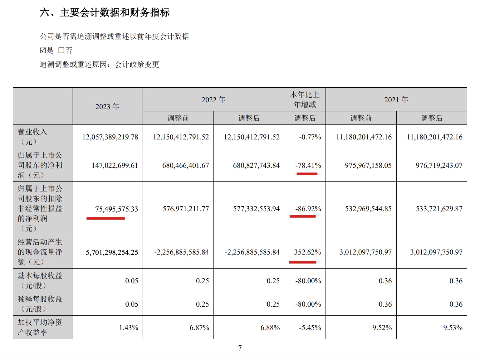 南山控股在2023年实现了营业收入120.57亿元,同比微降0.77%;归属于上市公司股东的净利润为1.47亿元,同比下降78.41%;归属于上市公司股东的扣非净利润为7549.56万元,同比下降86.92%。经营活动产生的现金流量净额为57.01亿元,同比上升352.62%。加权平均净资产收益率为1.41%,基本每股收益为0.05元/股。