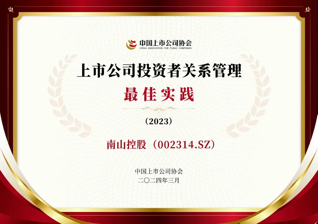 近日,由中国上市公司协会(以下简称“中上协”)举办的“上市公司投资者关系管理最佳实践”评选活动结果揭晓,南山控股荣获2023年度“上市公司投资者关系管理最佳实践”荣誉。