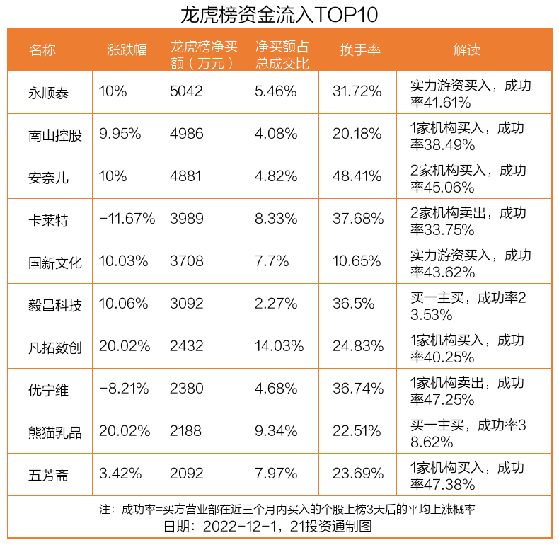 12月1日,上证指数上涨0.45%,深证成指上涨1.4%,创业板指上涨1.53%。盘后龙虎榜数据显示,共有42只个股因当日异动登上龙虎榜,资金净流入最多的是永顺泰(001338.SZ),达0.5亿元。