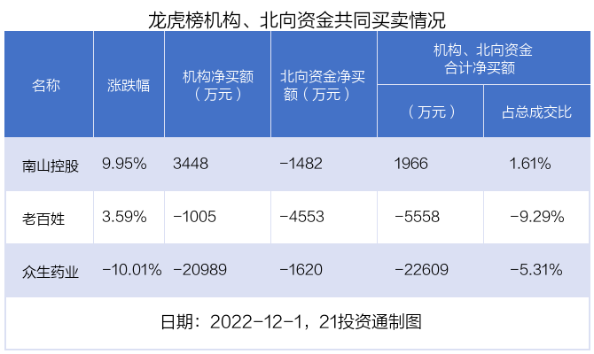值得注意的是,机构和北向资金共同净卖出了众生药业、老百姓等2股;在南山控股上出现分歧,机构净买入南山控股3447.8万元,北向资金净卖出1481.89万元。