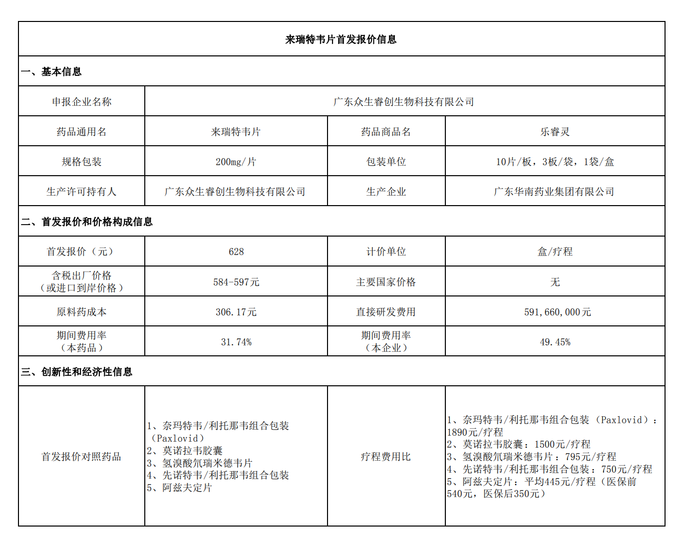 3月28日,据上海市医保局官网披露,广东众生睿创生物科技有限公司的新冠口服药来瑞特韦片(商品名:乐睿灵,200mg*30片/盒)的首发报价为628元/盒/疗程。