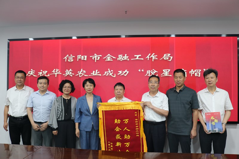 6月13日,潢川县党委副书记、县长余华,河南华英农业发展股份有限公司董事长许水均一行专程到信阳市金融工作局送上锦旗和感谢信,对市金融工作局充分发挥金融主力军作用,高效化解上市公司风险,助力华英农业成功“脱星摘帽”表示感谢。