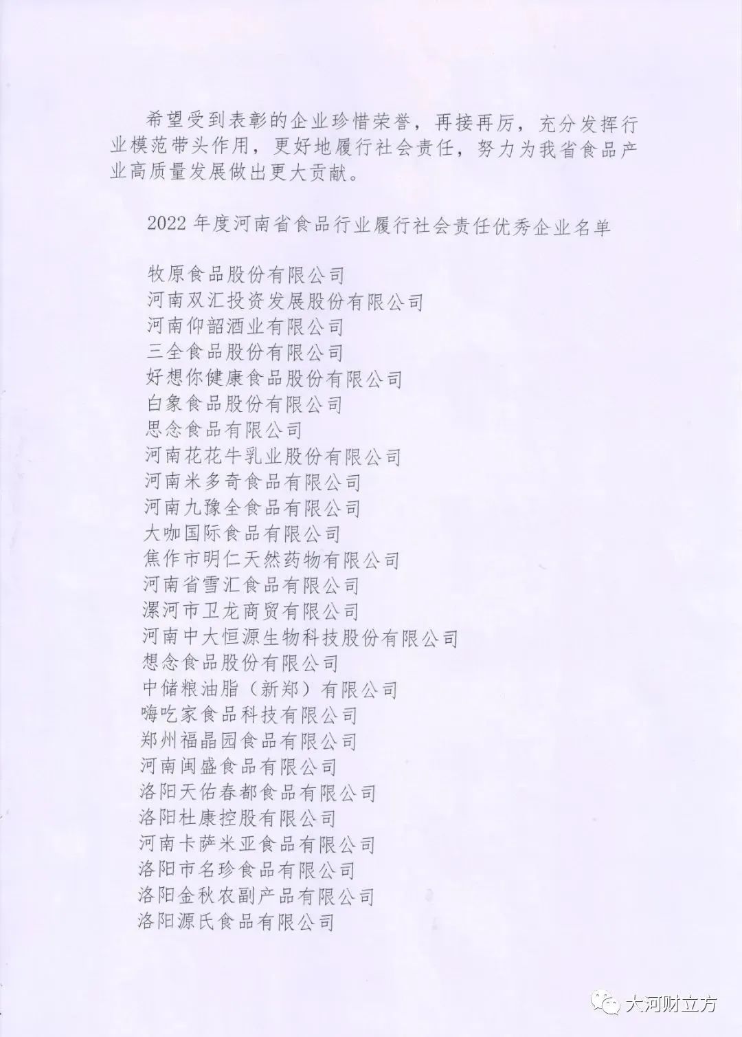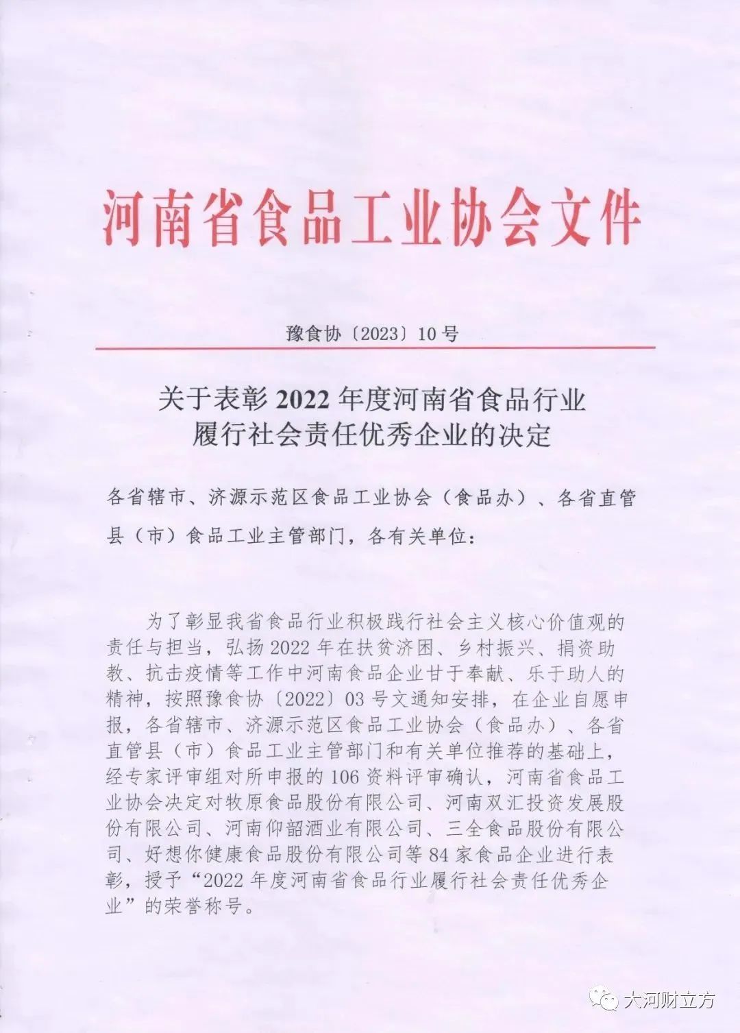 据悉,为了弘扬全省食品行业2022年在扶贫济困、乡村振兴、捐资助教、抗击疫情等工作中甘于奉献、乐于助人的精神,在企业自愿申报,各省辖市、济源示范区食品工业协会(食品办)、各省直管县(市)食品工业主管部门和有关单位推荐的基础上,经专家评审组对所申报资料评审确认,6月26日,河南省食品工业协会决定对牧原食品股份有限公司、河南双汇投资发展股份有限公司、河南华英农业发展股份有限公司等84家食品企业进行表彰,授予“2022年度河南省食品行业履行社会责任优秀企业”的荣誉称号,华英农业荣耀入选名列榜中。