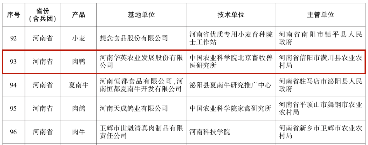 8月22日,农业农村部办公厅公布了第一批农业高质量发展标准化示范基地(国家现代农业全产业链标准化示范基地)创建单位名单,经县市审核、省级推荐和农业农村部组织专家对创建方案进行论证,确定第一批178个示范基地创建单位予以公布,河南华英农业发展股份有限公司作为唯一一家肉鸭行业企业荣耀上榜。