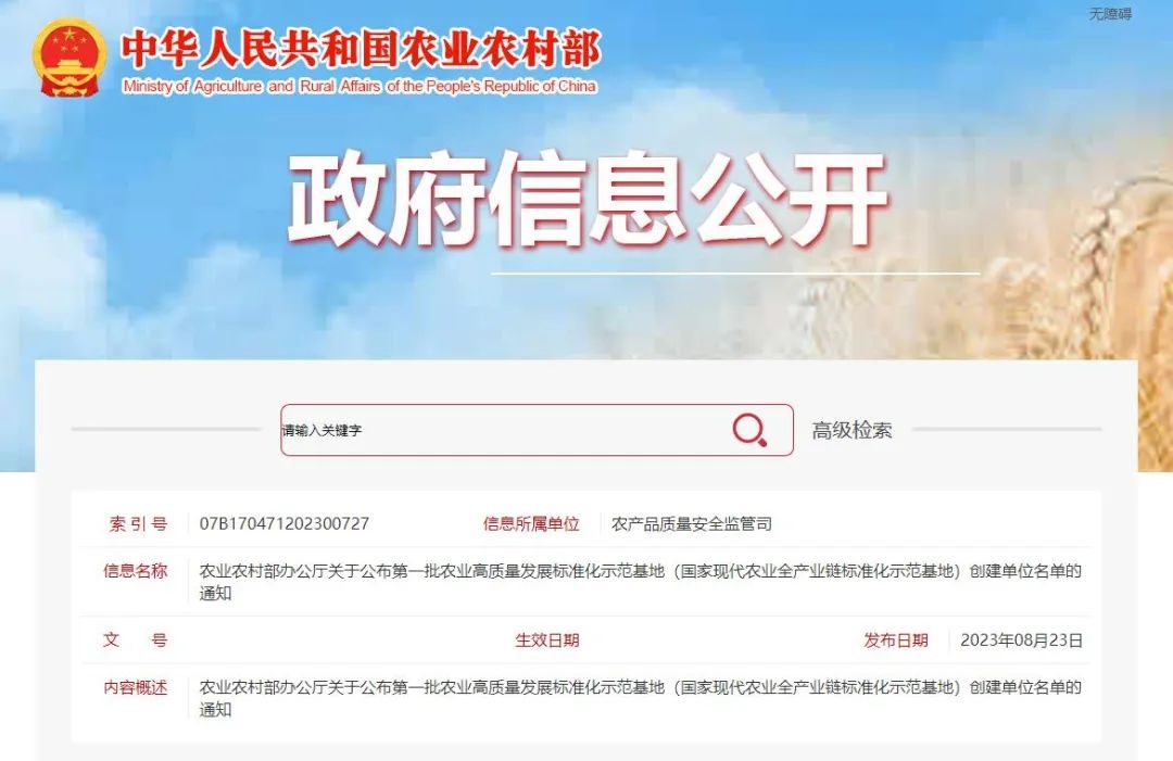 2022年7月,农业农村部正式启动国家现代农业全产业链标准化示范基地创建,该项目农业农村部为保障农产品质量安全、促进农业高质量发展的一项创新性举措,示范基地采取“基地单位+技术单位+主管单位”联合创建的模式。