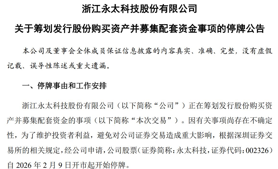 2月8日,永太科技(002326.SZ,股价28.77元,市值266.16亿元)公告称,公司正在筹划发行股份购买资产并募集配套资金的事项,股票自2026年2月9日开市起停牌。