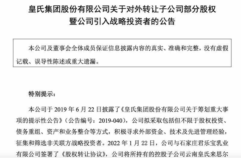 1月24日,南都记者注意到,广西上市公司皇氏集团在当日早间发布公告,表示该公司在1月22日与君乐宝乳业签署《股权转让协议》,皇氏集团将所持有的控股子公司云南皇氏来思尔乳业有限公司20%股权及云南皇氏来思尔智能化乳业有限公司20%股权转让给君乐宝乳业。