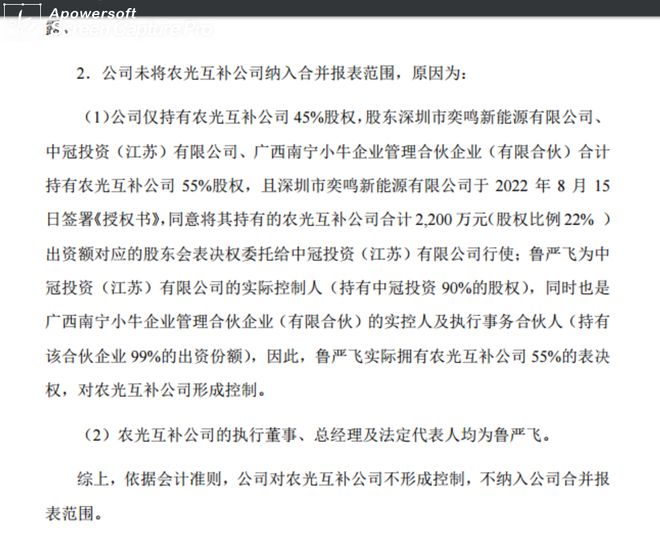 根据公告,作为第一大股东的皇氏集团之所以未将农光互补并表、未获得其控制权,是由于其他两名股东中冠投资、南宁小牛均是鲁严飞的持股公司,再加上在8月15日新加入的第二大股东奕鸣新能源将22%投票权授权给了鲁严飞,这样鲁严飞便成为农光互补的实际控制人。
