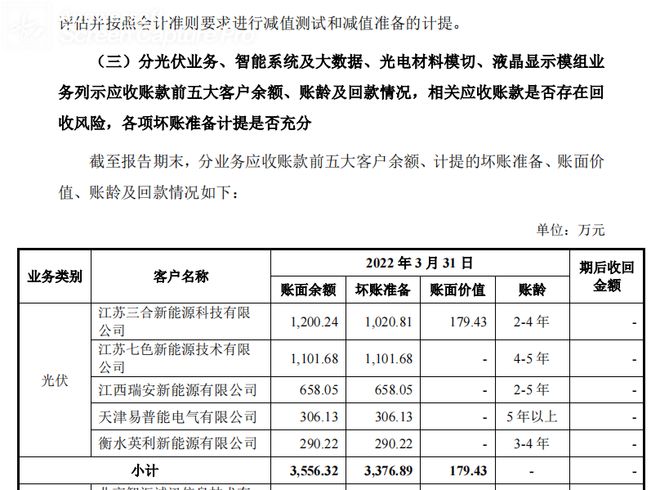 在锦富技术的2022年半年报及相关问询函中,其光伏业务的应收账款第一大、第二大客户便是上述潘孝争的关联公司江苏三合及江苏七色,两家公司涉及金额均在千万元以上,而鲁金明、鲁严飞共同任职的阳光普世也被列为长期应收款坏账对象,目前,上述应收款已悉数计提坏账。