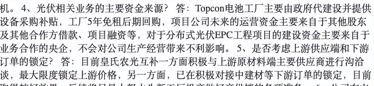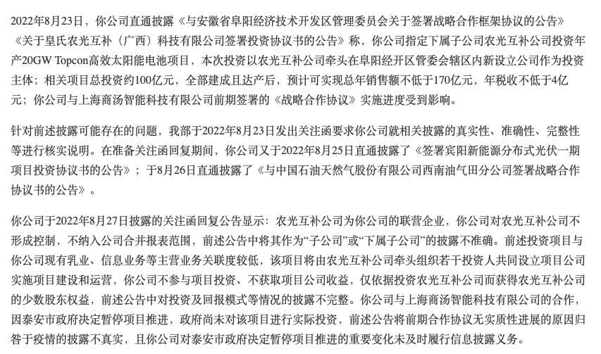 8月26日,皇氏集团回复关注函称,公司出资皇氏农光互补公司的金额为4500万元,持股占比45%,为公司的联营企业,公司对皇氏农光互补不形成控制,不纳入公司合并报表范围。在该项目中不直接参与投资,没有资金流出,主要通过对皇氏农光互补公司的投资获得少数股东权益等。