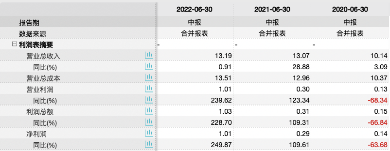 营销翻车之时,皇氏集团的营收增速放缓。wind数据显示,2020年中期—2022年中期皇氏集团营收分别为10.14亿元、13.07亿元、13.19亿元,同比增速分别为3.09%、28.88%、0.91%;净利润分别为0.14亿元、0.29亿元、1.01亿元,同比增速分别为-63.68%、109.61%、249.87%。可以看出,今年上半年皇氏集团营收增速相较去年同期的28.88%下滑明显。