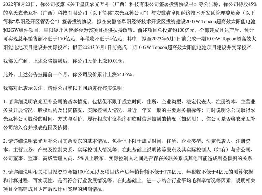 值得注意的是,同一天皇氏集团收到深交所关注函,要求其说明皇氏农光互补公司及其余股东的基本情况;相关项目投资总金额100亿元以及项目达产后年销售额不低于170亿元,年税收不低于4亿元的测算依据和计算过程、可实现性、是否符合行业发展情况等;结合新能源行业发展、竞争对手、行政审批等情况,充分提示上述项目投资存在的风险,以及公司是否存在利用信息披露配合二级市场炒作的情形等。