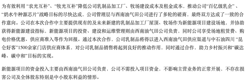 对于这项合作,皇氏集团给出的理由是有效利用“农光互补”“牧光互补”降低公司乳制品加工厂、牧场建设成本及租金成本,推动公司“百亿级乳企”“奶水牛种源芯片”战略目标尽快达成。资金投入由西南油气田公司负责,皇氏集团不需投入项目资金。