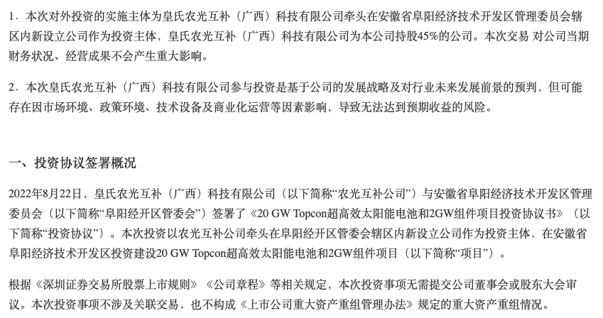 8月23日,皇氏集团发布公告称,其持股45%的皇氏农光互补(广西)科技有限公司(以下简称:皇氏农光互补公司)与安徽省阜阳经济技术开发区管理委员会签署《20GW Topcon超高效太阳能电池和2GW组件项目投资协议书》,以皇氏农光互补公司牵头在阜阳经开区管委会辖区内新设立公司作为投资主体。项目全部建成达产后,预计可实现年销售额不低于170亿元,年税收不低于4亿元。