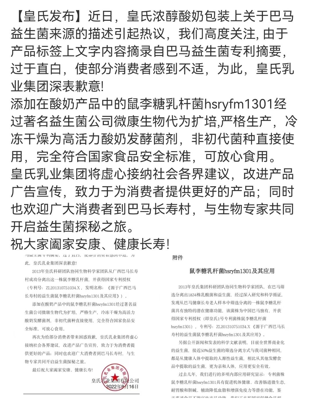 添加在酸奶产品中的鼠李糖乳杆菌hsryfm1301经过著名益生菌公司微康生物代为扩培,严格生产,冷冻干燥为高活力酸奶发酵菌剂,非初代菌种直接使用,完全符合国家食品安全标准,可放心食用。皇氏乳业集团将虚心接纳社会各界建议,改进产品广告宣传。
