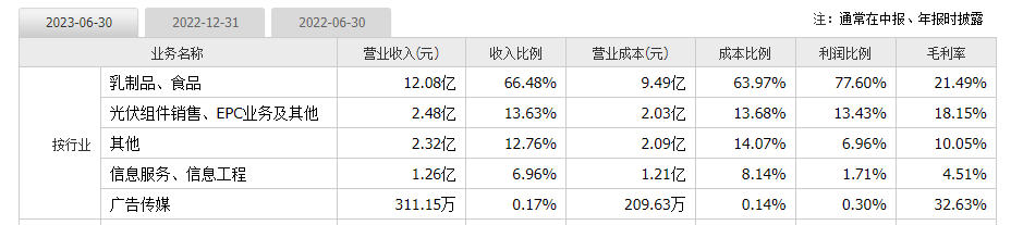 考量在于,来思尔乳业是皇氏集团的现金牛之一,且乳制品、食品仍是主营收来源,今年上半年销售收入达12.08亿元,占比超过6成;而光伏组件销售、EPC等业销售收入2.48亿元,占营收比仅13.63%,远未扛起增长大旗。