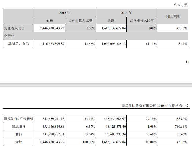 靠着“买买买”,皇氏集团主业变为“乳业+影视文化”双驱。2016年,皇氏乳制品、食品业务贡献营收11.17亿元,占同期营收比45.65%;影视制作、广告传媒业务贡献8.43亿元,占比34.44%。此外,信息服务业务营收1.56亿元,其他业务贡献3.31亿元。