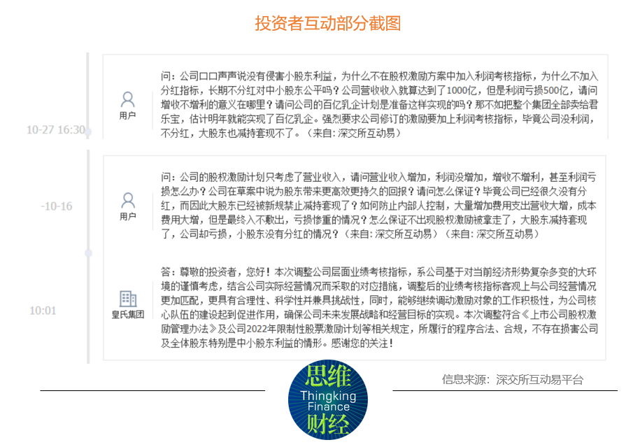 从10月18日公司的回复公告看出,上述激励计划调整的公告发出不久,皇氏集团即收到了深交所的问询函。