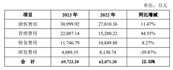 2023年,皇氏集团的销售费用约为3.1亿元,同比增长11.47%;管理费用约为2.21亿元,同比增长44.55%;财务费用约为1.17亿元,同比增长8.27%;研发费用约为4889.35万元,同比下滑39.87%。