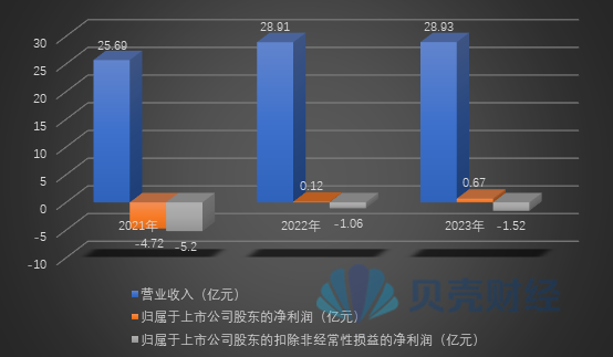 2023年,皇氏集团实现归属于上市公司股东的净利润(简称:净利润)约0.67亿元,同比增长460.11%,与此同时,公司归属于上市公司股东的扣除非经常性损益的净利润(简称:扣非后净利润)连续三年处于亏损状态,2021年至2023年扣非后净利润分别约为-5.2亿元、-1.06亿元、-1.52亿元。
