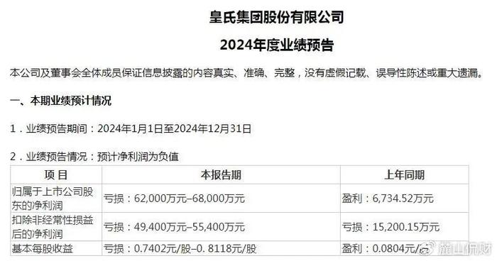 2025年1月22日,皇氏集团发布2024年度业绩预告,预计全年归属于上市公司股东的净利润亏损6.2亿元至6.8亿元,同比由盈转亏,扣非后净亏损进一步扩大至4.94亿至5.54亿元。