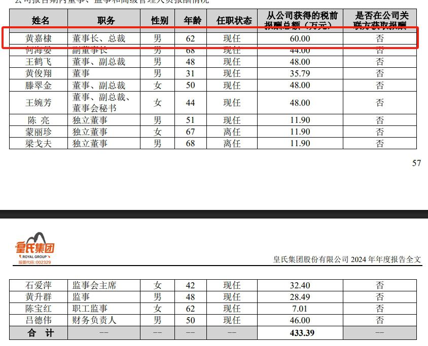 2024 年,皇氏集团董事、监事和高级管理人员报酬合计为 433.39 万元。其中,公司董事长、总裁黄嘉棣 2024 年领取薪酬 60 万元,与上年持平。