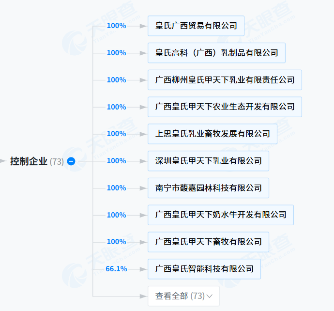 根据披露的股权结构,皇氏集团的实际控制人黄嘉棣直接持有该公司24.78%的股份。从企业控制关系来看,皇氏集团对外投资布局广泛,目前实际控制的企业总数达73家。