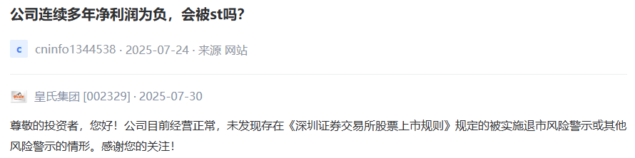 针对皇氏集团当前业绩表现情况,2025年7月,有投资者在深交所互动易平台留言提问,“公司连续多年净利润为负,会被ST吗”。皇氏集团回应称,“公司目前经营正常,未发现存在《深圳证券交易所股票上市规则》规定的被实施退市风险警示或其他风险警示的情形。