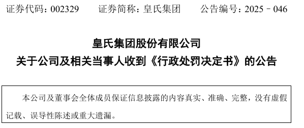 2025年6月14日,公司发布收到行政处罚公告,内容显示,经广西证监局调查发现,皇氏集团在2019年至2022年期间存在重大信息披露遗漏问题。2019年11月,其全资子公司皇氏数智与东岳财富签订补充协议,涉及两项关键条款:一是承诺东岳财富每年获得6.5%的保底收益,差额部分由皇氏数智补足;二是约定若基金2025年净利润未达4亿元,皇氏数智需回购东岳财富持有的3.1亿元基金份额。然而,该重大或有负债事项未在2019-2022年年度报告中披露,直至2023年11月才予以公开,违反《证券法》相关规定。