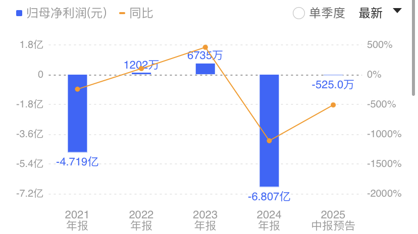 而归母净利润同样呈现剧烈波动趋势,2021-2024年数值分别为-4.72亿元、0.12亿元、0.67亿元和-6.81亿元。2025年业绩预告显示亏损持续,预计亏损350-700万元,同比最大下滑幅度达645.77%,盈利稳定性明显不足。