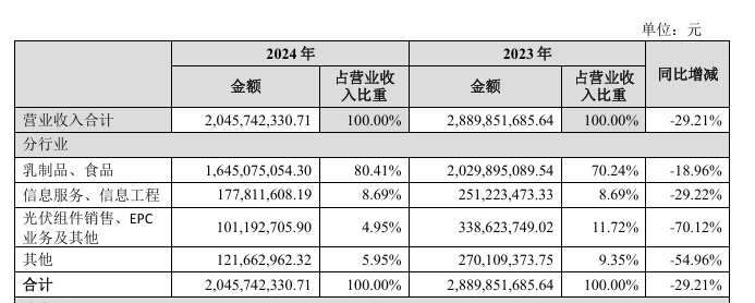 皇氏集团作为国内水牛奶销量领先的乳制品企业,其核心业务聚焦于特色乳品产业链。根据公司2024年报披露的经营数据,近两年乳制品及食品业务贡献了70%-80%的营业收入,构成企业主要的收入来源。值得注意的是,公司目前仍保留部分非乳业资产,其中云通信服务和光伏组件等跨界业务累计约占整体营收的20%。