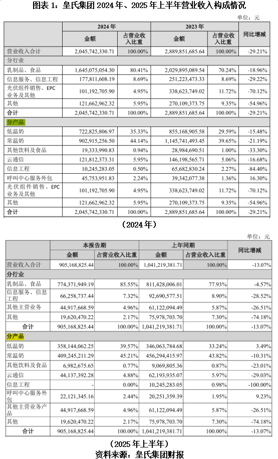 财报显示,2024年,皇氏集团的营收规模为20.46亿元,同比下降29.21%。其中,乳制品和食品业务收入为16.45亿元,同比下降18.96%;信息服务和信息工程业务收入为1.78亿元,同比下降29.22%;光伏组件销售、EPC业务及其他收入为1.01亿元,同比下降70.12%。