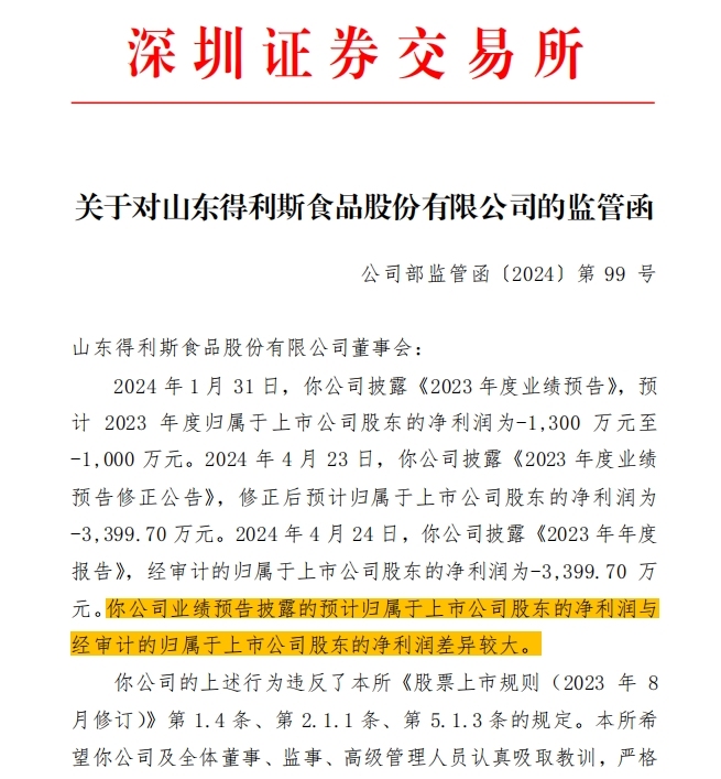 5月20日,深交所向得利斯(002330 )下发监管函。监管函指出,因公司业绩预告披露的预计归属于上市公司股东的净利润与经审计的归属于上市公司股东的净利润差异较大,得利斯违反了深圳证券交易所《股票上市规则(2023年8月修订)》第1.4条、第2.1.1条、第5.1.3条的规定,深交所要求得利斯认真吸取教训,严格遵守《证券法》《公司法》等法律法规,杜绝此类事件的再次发生。