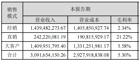 这三种销售方式中,经销模式和大客户模式营收占比较高,合计达到九成营收,但是,这两种销售渠道的毛利率却不尽如人意,仅为个位数。其中,经销模式毛利率为2.34%,大客户模式毛利率为5.58%。营收占比不足一成的直销模式毛利率较高,达到21.22%。