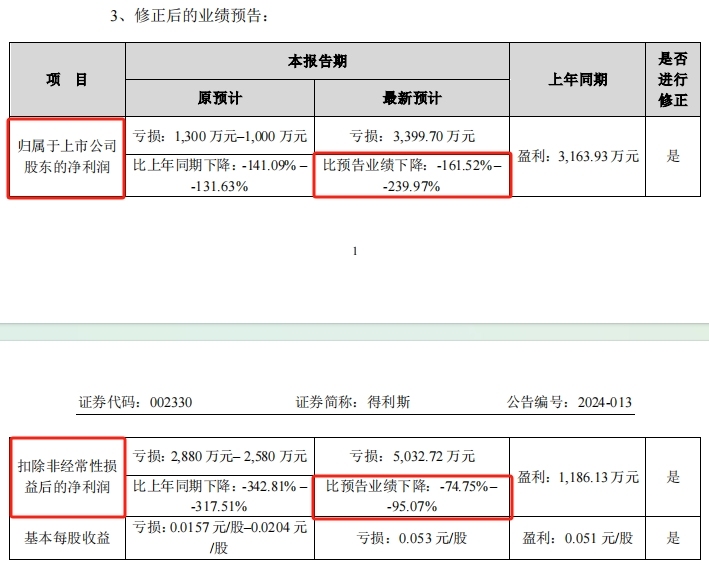 记者注意到,相比于业绩预告,得利斯修正后的归属于上市公司股东的净利润下降了161.52%-239.97%,修正后的扣除非经常损益后的净利润下降了74.75%-95.07%。