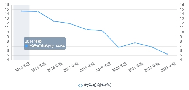 毛利率方面,2023年公司毛利率下降1.62个百分点至5.30%。实际上,不仅是2023年,近十年(2014年-2023年),公司毛利率整体持续下降,由14.64%下降到5.30%,已经“膝斩”。