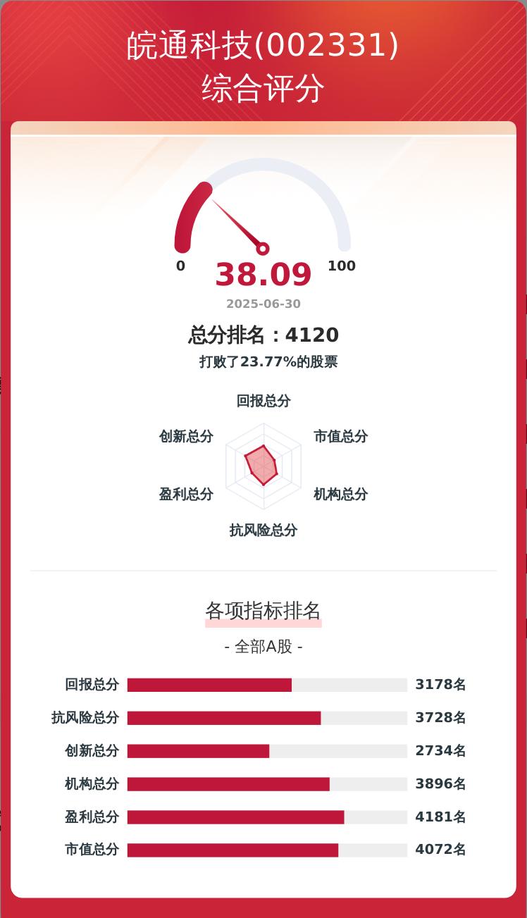上市公司研究院构建了一套上市公司韧性评价体系,从企业盈利、科技创新、股东回报、经营抗风险、市值表现及机构吸引力六个维度对企业进行量化评分,满分为100分。皖通科技的韧性评价总分为38.09分,在A股5405家可比上市公司中排名第4120位。