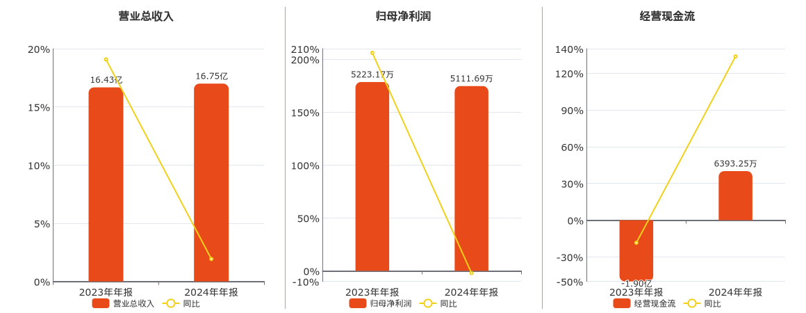 公司营业总收入为16.75亿元。归母净利润为5111.69万元,较去年同报告期归母净利润减少111.48万元,同比较去年同期下降2.13%。经营活动现金净流入为6393.25万元。